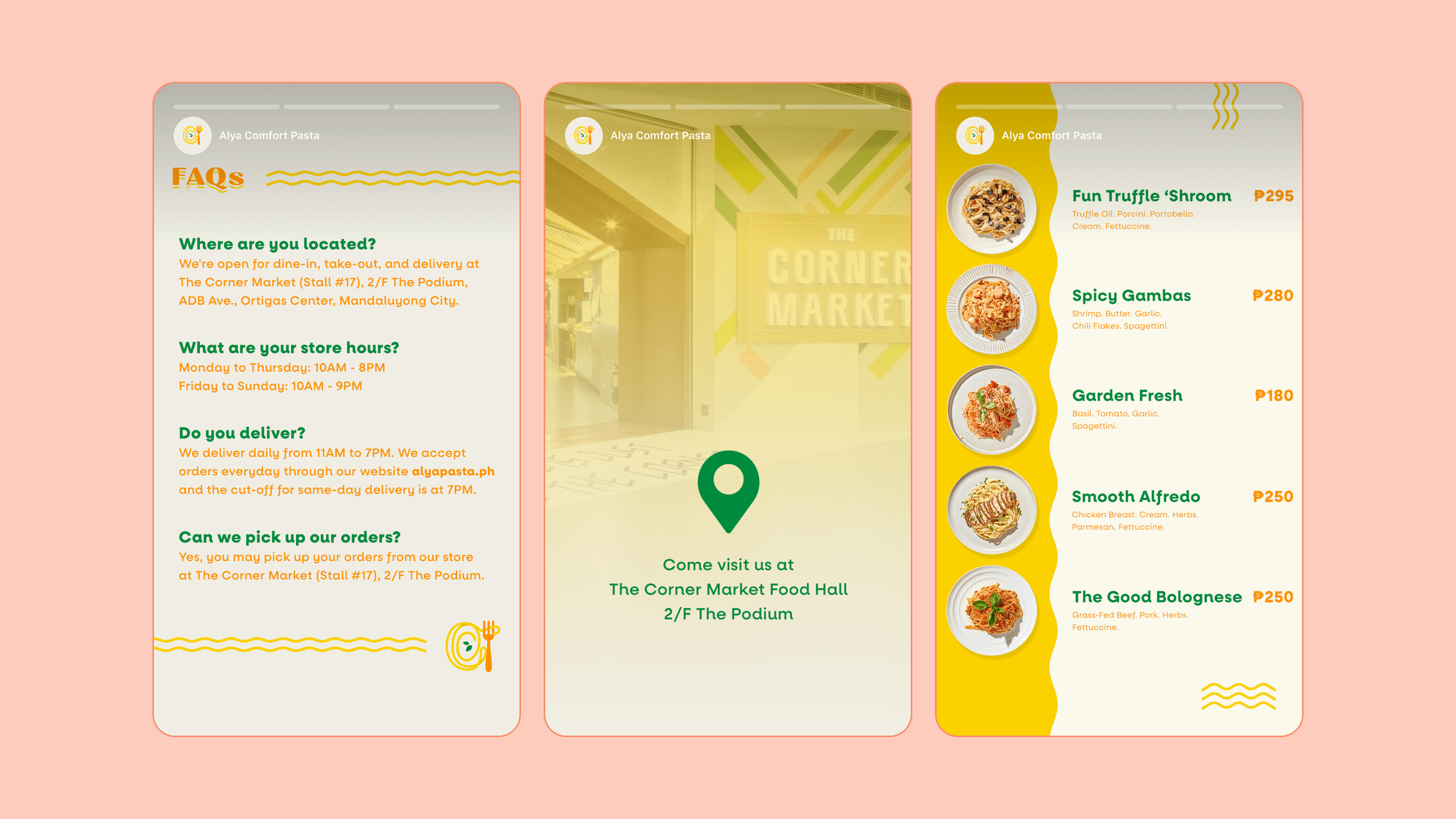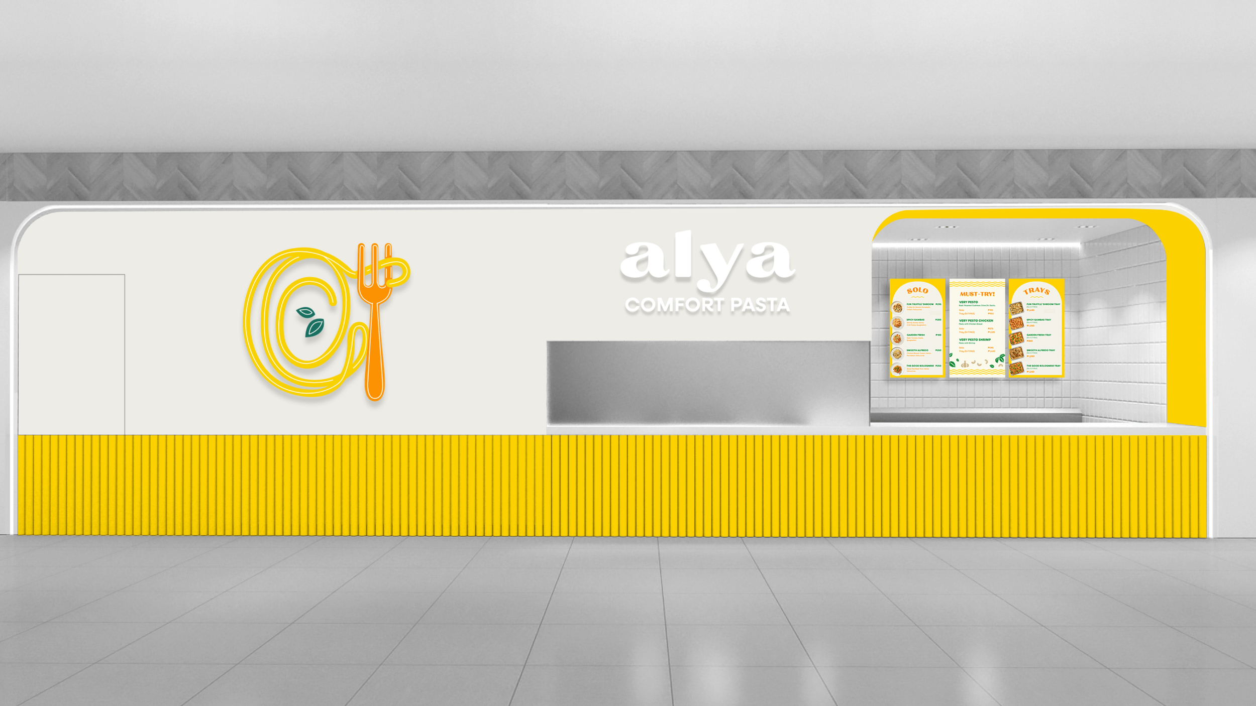 Building upon their initial tagline, “Pasta for All,” we crafted a visual identity for Alya that embodies playfulness, approachability, and a contemporary flair, breaking free from the typical Italian aesthetic and often intimidating vibe of pasta-focused establishments. Drawing inspiration from the vibrant ingredients and flavors, we utilised a colour palette that conveys freshness and incorporated graphic elements that are reminiscent of pasta noodles.